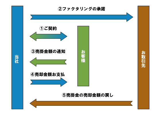 お客様がお持ちの売掛金を買い取り、売却代金をお支払いするサービスのことをファクタリングといいます。 支払期日になるまで、通常売掛金は支払われません。その眠っている売掛金をお客様から買い取り、支払期日より前に売却代金をお支払いする、これがファクタリングのしくみです。